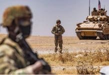 American soldiers stand near a Bradley Fighting Vehicle (BFV) during a patrol near the Rumaylan (Rmeilan) oil wells in Syria's northeastern Hasakah province, on...